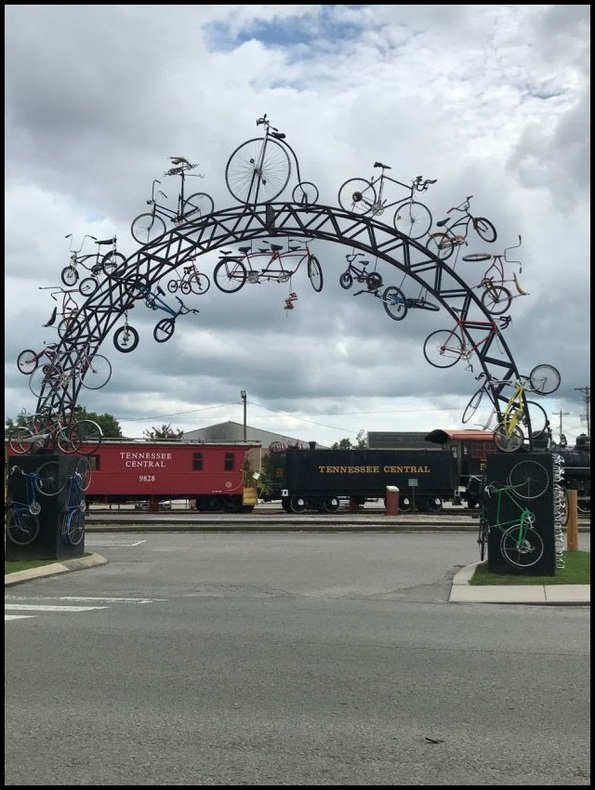 The Spokes Sculpture is a large steel arch with welded funky bicycles (including a high-wheeled penny farthing and a five-seater) and small bike-part sculptures (Check out the pair of sneakers and the weather vane). Spokes is the first public art in Cookeville made by local artists, using recycled bicycles and bike parts from members of the local community. It marks the entrance to the bike path between Cookeville and neighboring Algood.